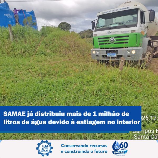 O Serviço Autônomo Municipal de Água e Esgoto de Campos Novos (SAMAE) já distribuiu mais de 1 milhão de litros de água desde janeiro deste ano para atender comunidades do interior afetadas pelo período de estiagem.